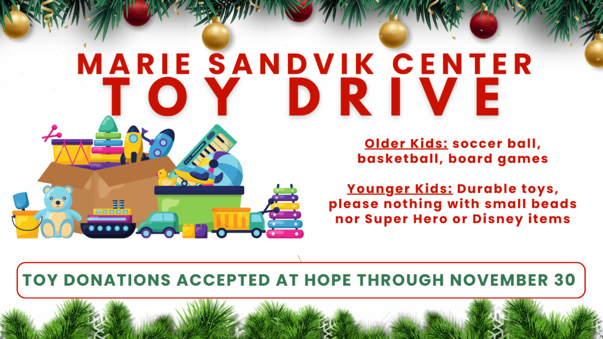 As you may know, we are collecting toys for the Marie Sandvik Center and this Sunday is the last Sunday to bring items to Hope. See the graphic above. If you would like to know more about the Marie Sandvik Center click here,