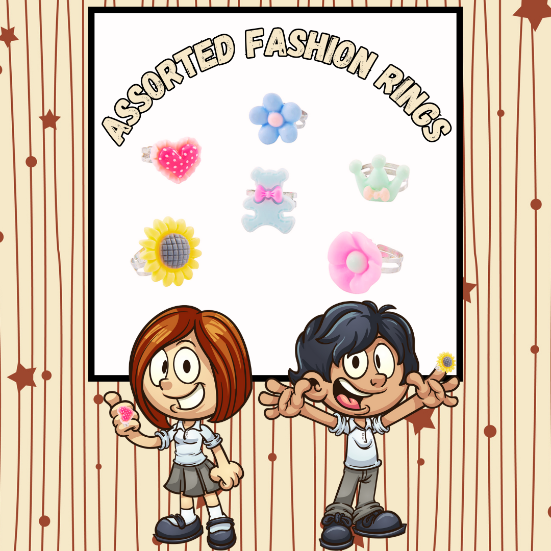 Discover the enchanting world of our Assorted Fashion Rings, a delightful collection designed to spark joy and inspire creativity in young hearts! These beautiful assorted fashion rings are all adjustable. Fits younger children.
