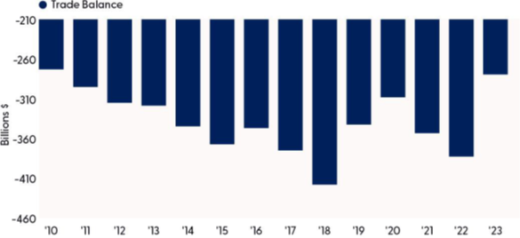 Third, trade deficits are narrower now. Because of reshoring and other factors, the deficit with China is the lowest since 2010 and significantly better than the depths of 2018. In 2023, the deficit shrunk to -$279 billion, which was a 17% decrease in total trade with China compared to 2022 (Figure 3). As U.S. businesses have diversified their reliance on foreign labor and production, the U.S. in aggregate will feel less impact if a trade war with China ignites.