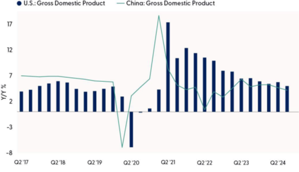 First, the tables have turned when it comes to growth between the U.S. and China. Now, China is in a more vulnerable economic position than before. Their corporate and household debt burdens are much higher than in the U.S., Chinese consumer demand is softer, and their real estate market is floundering. As investors anticipate what upcoming trade policy could do to the U.S. economy and domestic inflation, we should consider the economic environment. In 2018, the U.S. economy was slowing down from a near-term peak of almost 6% year-over-year growth to 3.8%, whereas the Chinese economy was steaming along at a steady 7% growth rate (Figure 1). Times have certainly changed since then for the Chinese economy, and their weakness gives the U.S. certain negotiating power in trade discussions as foreign firms work to keep up steady business.