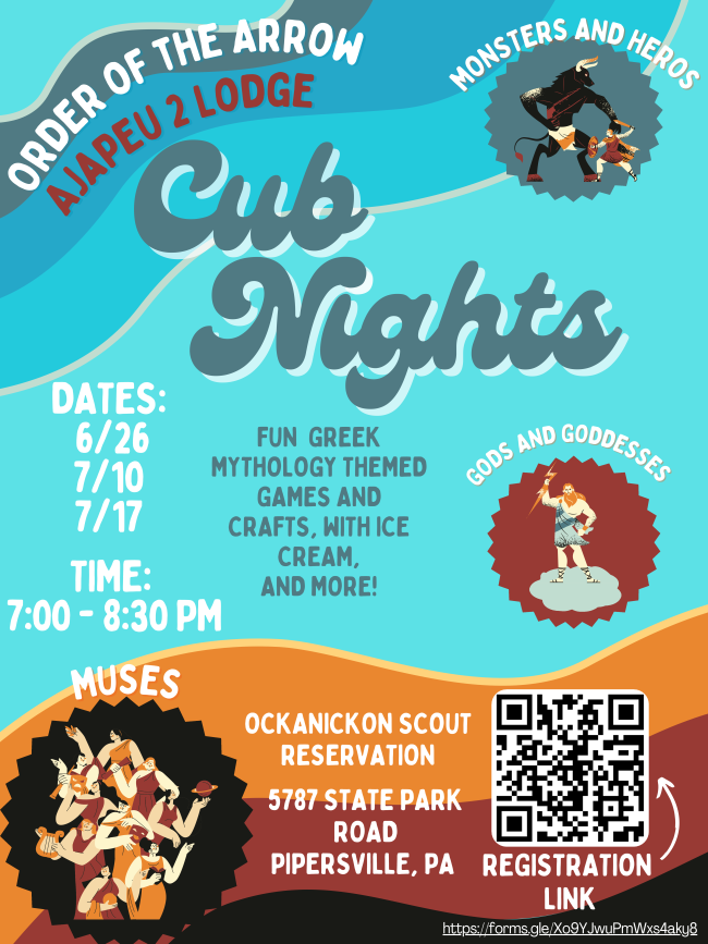 Come and enjoy an evening of fun-filled activities and ice cream at Ockanickon Scout Reservation hosted by Ajapeu Lodge 2. Our theme this year is Greek Mythology. There will be 3 separate nights and each will have different games, crafts and activities (and did we already mention Ice Cream!). Our Cub Nights are open to all Cub Scouts, siblings and guests ages 5-11 (all youth must be accompanied by a parent or guardian). There is no fee for the event but you must bring smiles, enthusiasm and be ready to have fun.