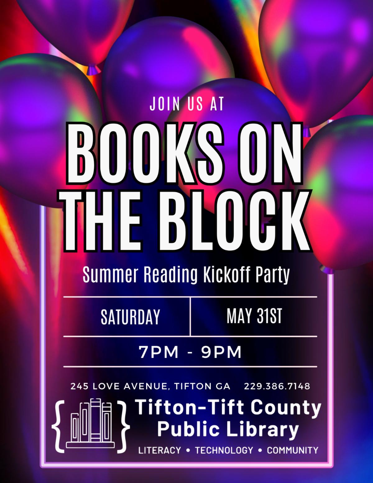 "Books on the Block" will kick off the Tifton-Tift County Public Library’s 2025 Summer Reading Program at 7-9 p.m. Saturday, starting at the library at 245 Love Ave., and extending down Library Lane.