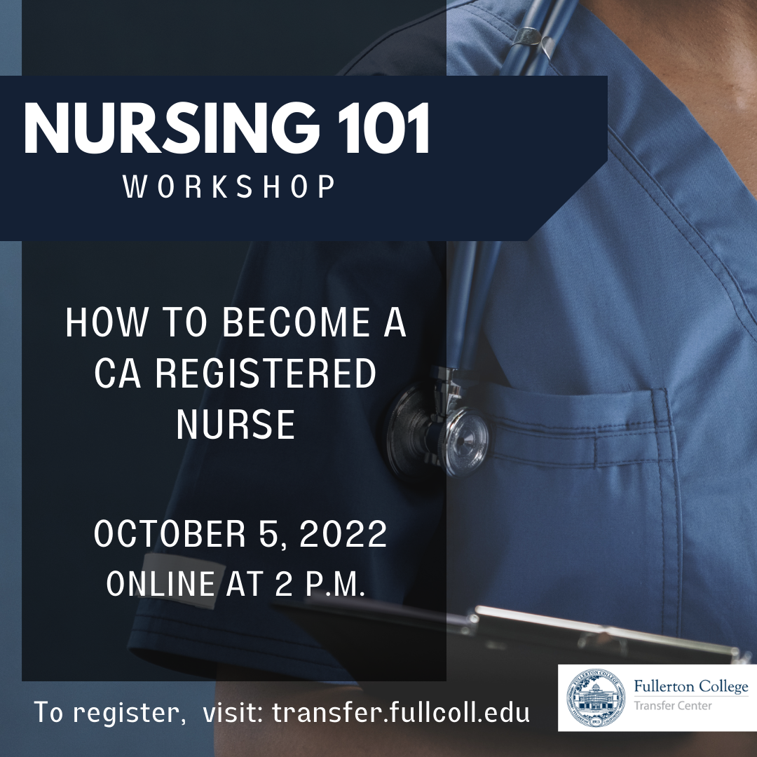 Join us for a virtual Nursing 101 Workshop on October 5, 2022 at 2 p.m. to learn how to become a California Registered Nurse! To register, visit the Transfer Center webpage here. Space is limited! | |