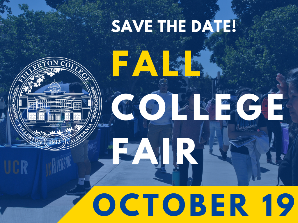 Save the date for Fullerton College's Fall College Fair taking place in-person on our campus quad on October 19, 2022 at 10 a.m. For updates, visit our College Fail webpage here.
