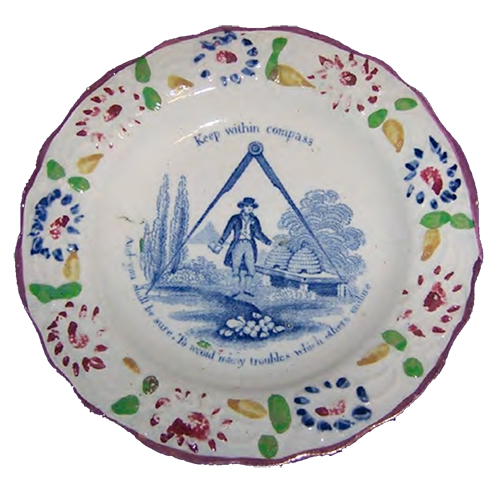 I decided to look for Masonic patterns in the TCC Pattern and Source Print Database in the hopes of learning more about the Masons. I remembered that I had entered a Masonic pattern in the Children's Subjects Category of the Database (left). It features a maxim by Benjamin Franklin (remember that he was a Mason) and a large compass (the Masons began as a Medieval Stonemason's guild and a compass was one of their symbols). Read the article.