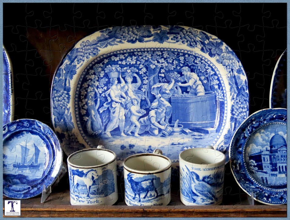 This month’s puzzle features a platter with the “Winemakers” pattern, plates with an American view, a marine subject, and three childrens' mugs. The “Winemakers” image source is an Italian print after artist Carlo Maratti engraved by Giovanni Girolamo Frezza, c. 1704. The pattern was produced by potter John Denton Bagster or (Baxter), in business from 1823 to 1827, in Hanley, Staffordshire and at least one other pottery. The plate on the left is from the “Irregular Shell Border Series by Enoch Wood & Sons,” in business from 1818 to 1846 in Burslem. This particular view appears not to be in the TCC database. The plate on the right shows the State House Boston. This version of the pattern (# 5798 in the TCC database) is by Ralph Stevenson & Williams (1825–1827) Cobridge. At least six other potters produced views of the Boston State House. The mugs, from left to right are “Present from New York” (DB 4772), “Present from Carolina” (DB 5858), and “Kingfisher,” which is not yet recorded in the database.