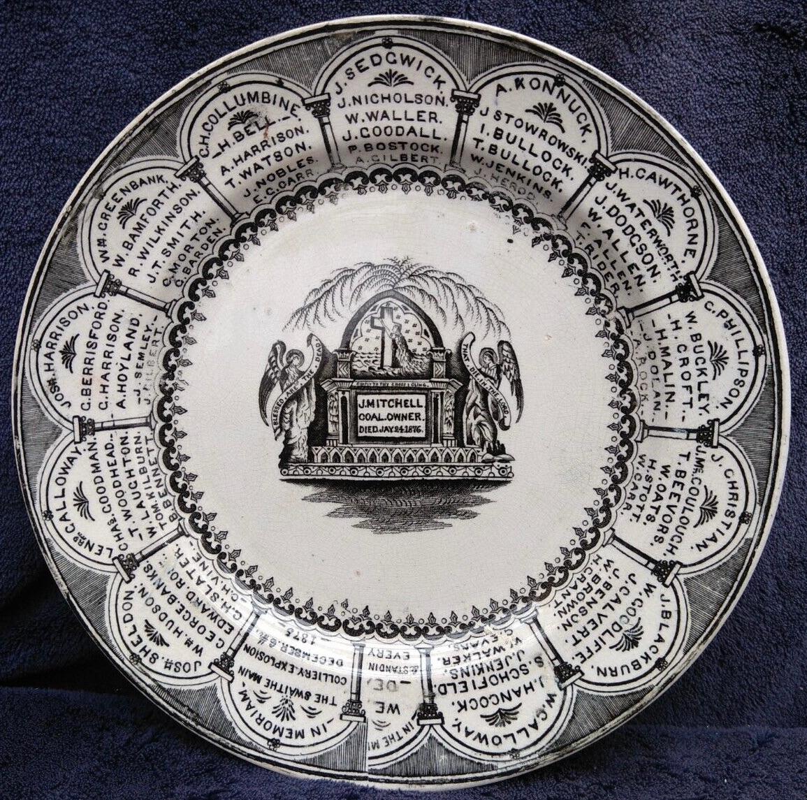 Shown is an 8.5 inch diameter plate, “In Memoriam, the Swaithe Main Colliery Explosion December 6th 1875", which commemorates a coal mine explosion in South Yorkshire, resulting in the deaths of 143 miners. This was the most deadly of several coal mine disasters that occurred that year. For TCC members, this is Pattern #13254 in the TCC Database of Patterns and Sources. View larger image. See past Patterns of the Month.