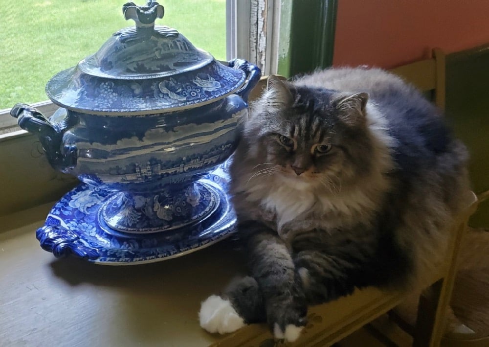 What could go wrong? The view on the tureen is 'Palace of the King of Delhi' from the John Hall & Sons Oriental Scenery series. Pattern # 1286 in the database. BTW, Jakie was a gentle giant and the odds of something going wrong were very very small. The cat’s name is Jakie. See larger image. See past Photos of the Month.