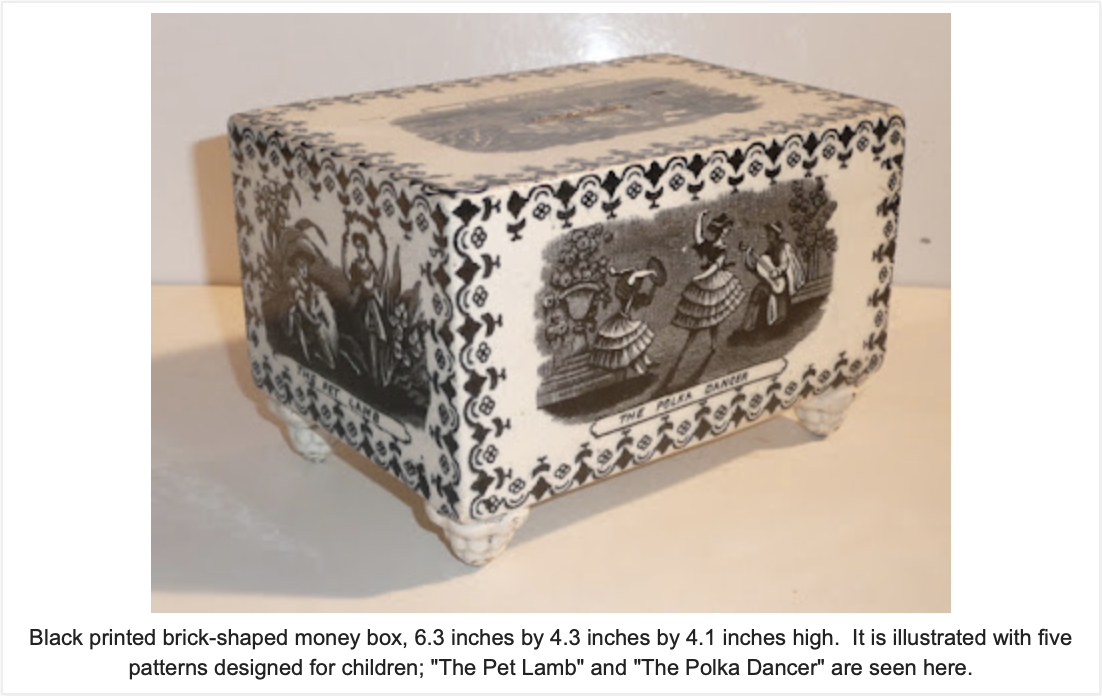 Black printed brick-shaped money box, 6.3 inches by 4.3 inches by 4.1 inches high. It is illustrated with five patterns designed for children; "The Pet Lamb" and "The Polka Dancer" are seen here. Read more.