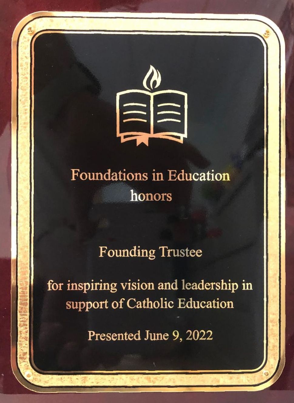Our Annual Board of Trustees Meeting was held on June 9th. Hosted by Chair Tom McInerney, we honored the 15 individuals first recruited by Bishop Frank to the Board of Trustees to help launch his vision for this Catholic School Foundation. From our humble beginnings, we have come a long way with much of the credit going to these contributing Founding Trustees who set the bar for those to follow. We are grateful to our current Trustees, too, who aptly carry forth the torch of our mission and who serve our cause so selflessly.