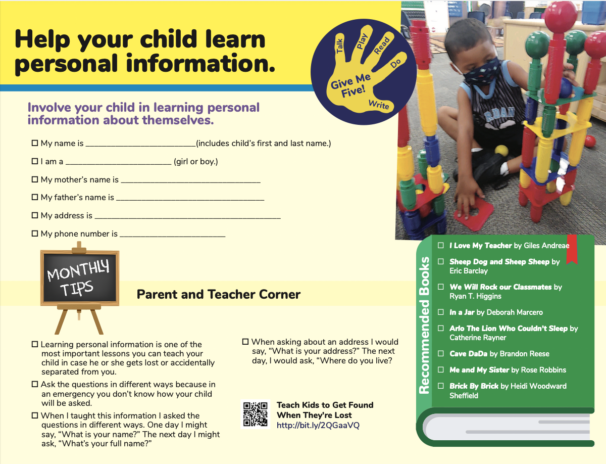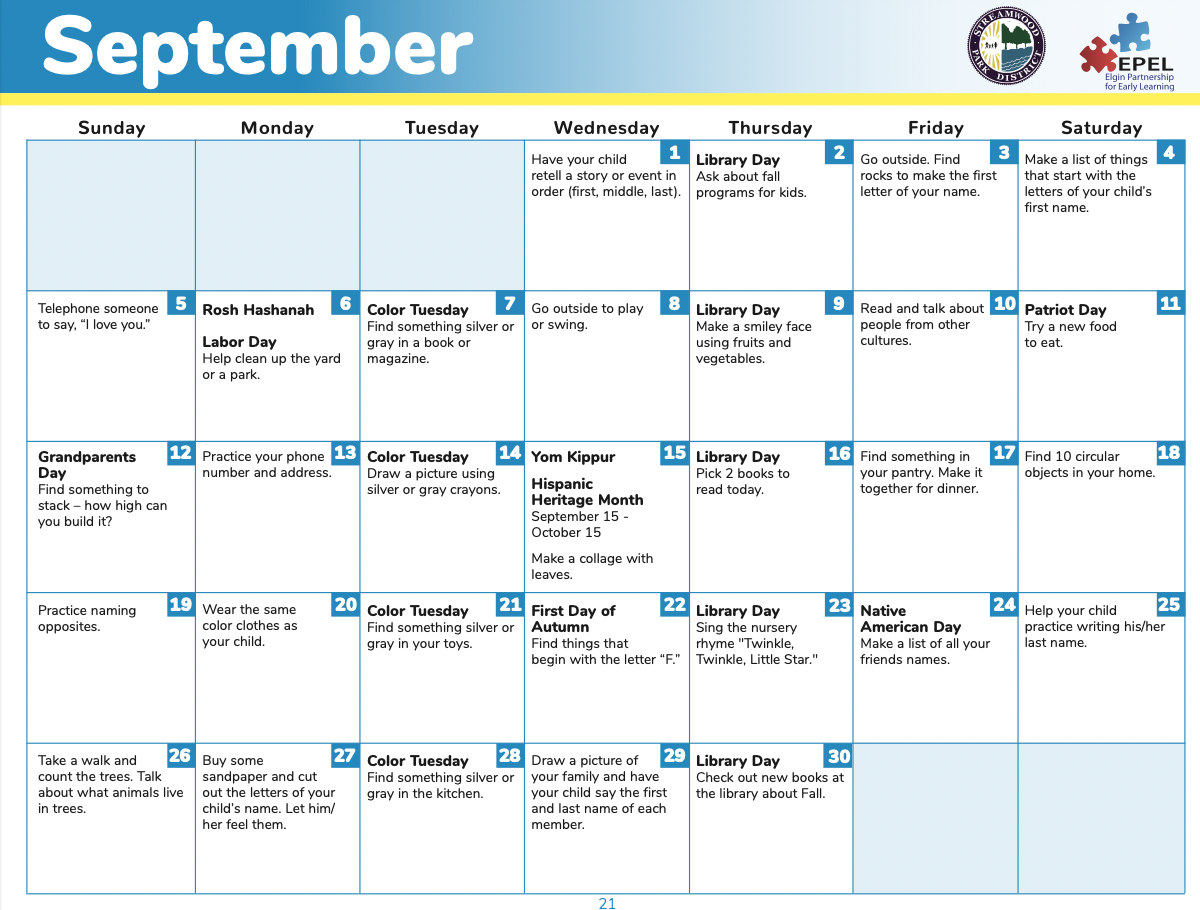 The Family Activity calendar gives daily tips on how to prepare your child for school. Each month focuses on important skills needed to set your child up for success in school.