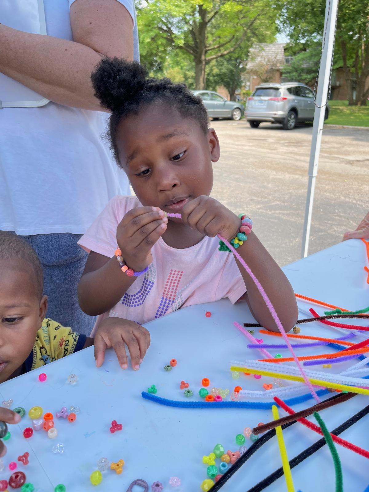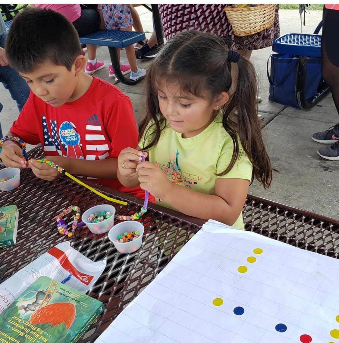 BUENA VISTA NEIGHBORHOOD: Working on fine motor skills. Mom had trouble getting her daughter to go home because she wanted to string more beads. Problem solved by sending home a small bag of beads.