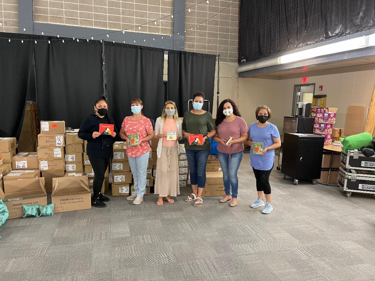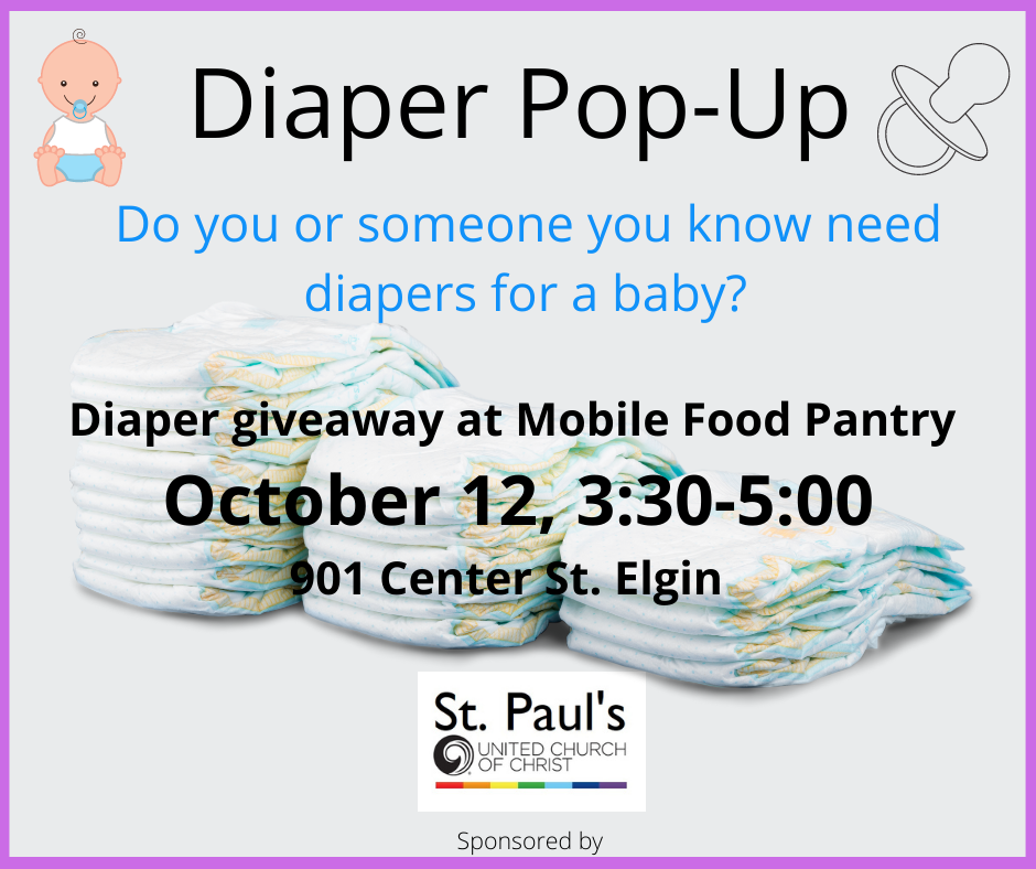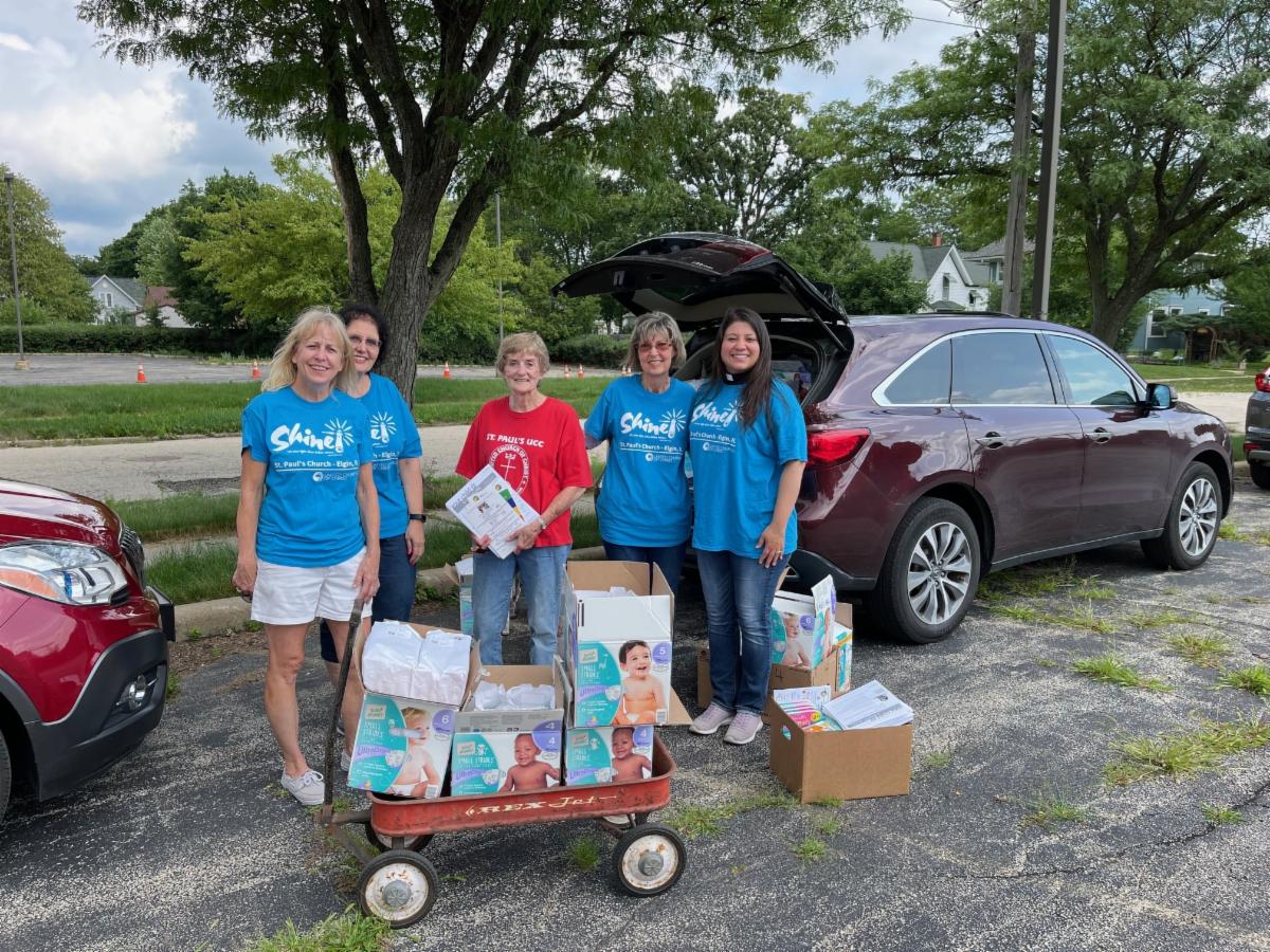 As a COVID response to meet basic needs, EPEL distributed diapers, wipes, books and early learning materials at mobile food pantries, Well Child for WIC families, VNA Health Care, Greater Family Health, U-46, Home Visiting programs, and YWCA. EPEL partner, St. Paul's United Church of Christ have taken over the work and funding diapers for families in the community. Their shirts say, "Shine," and we would agree that they are a ray of Sunshine for many young families in a pinch. Thank you, St. Pauls!