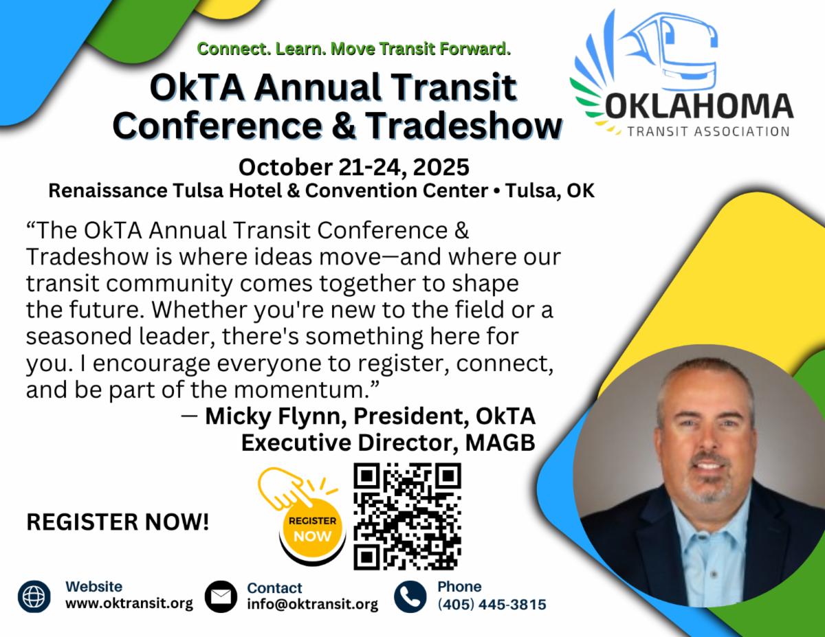 October 21–24, 2025 The countdown is on! In just a few weeks, transit professionals from across Oklahoma will gather in Tulsa for the premier event of the year — the OkTA Annual Conference & Tradeshow.