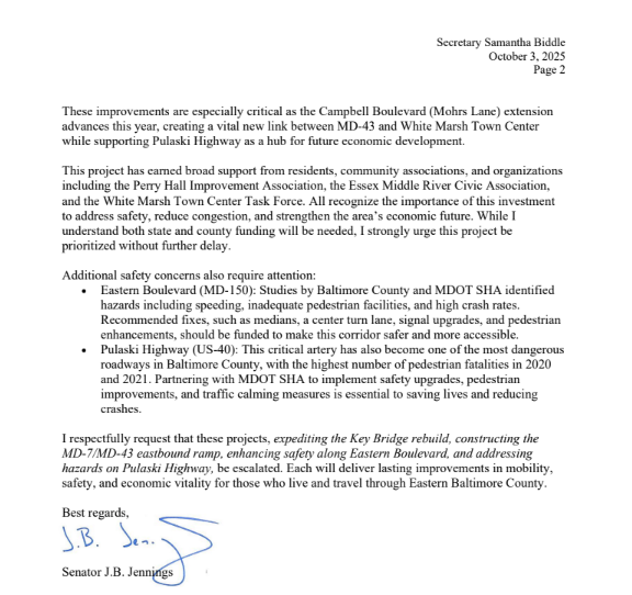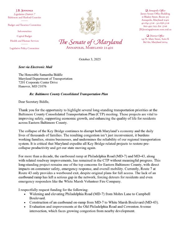 Prior to the meeting, I sent a letter to Acting Secretary Biddle, which included advocacy for projects critical to ensuring safety in Eastern Baltimore County. One of my staff members attended the event and voiced concerns to the panel regarding the following projects, which have gone without attention: