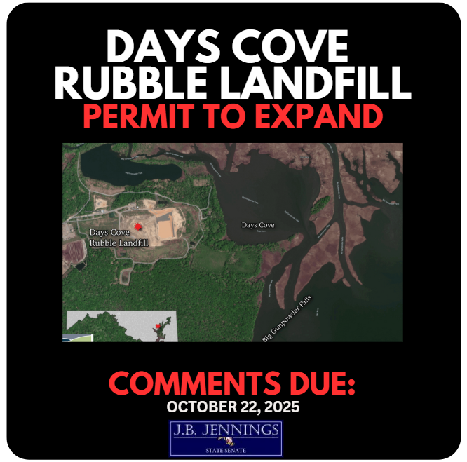 Last month, I joined a packed crowd at the Perry Hall Library where community members gathered to discuss the permit proposed by Days Cove Rubble Landfill. I spoke firmly against this permit, citing concerns about responsibility, environmental risks, and public health impacts. I was proud to stand alongside my colleagues, Delegates Szeliga and Nawrocki, and Baltimore County Councilman Marks, as well as many constituents who share these concerns.