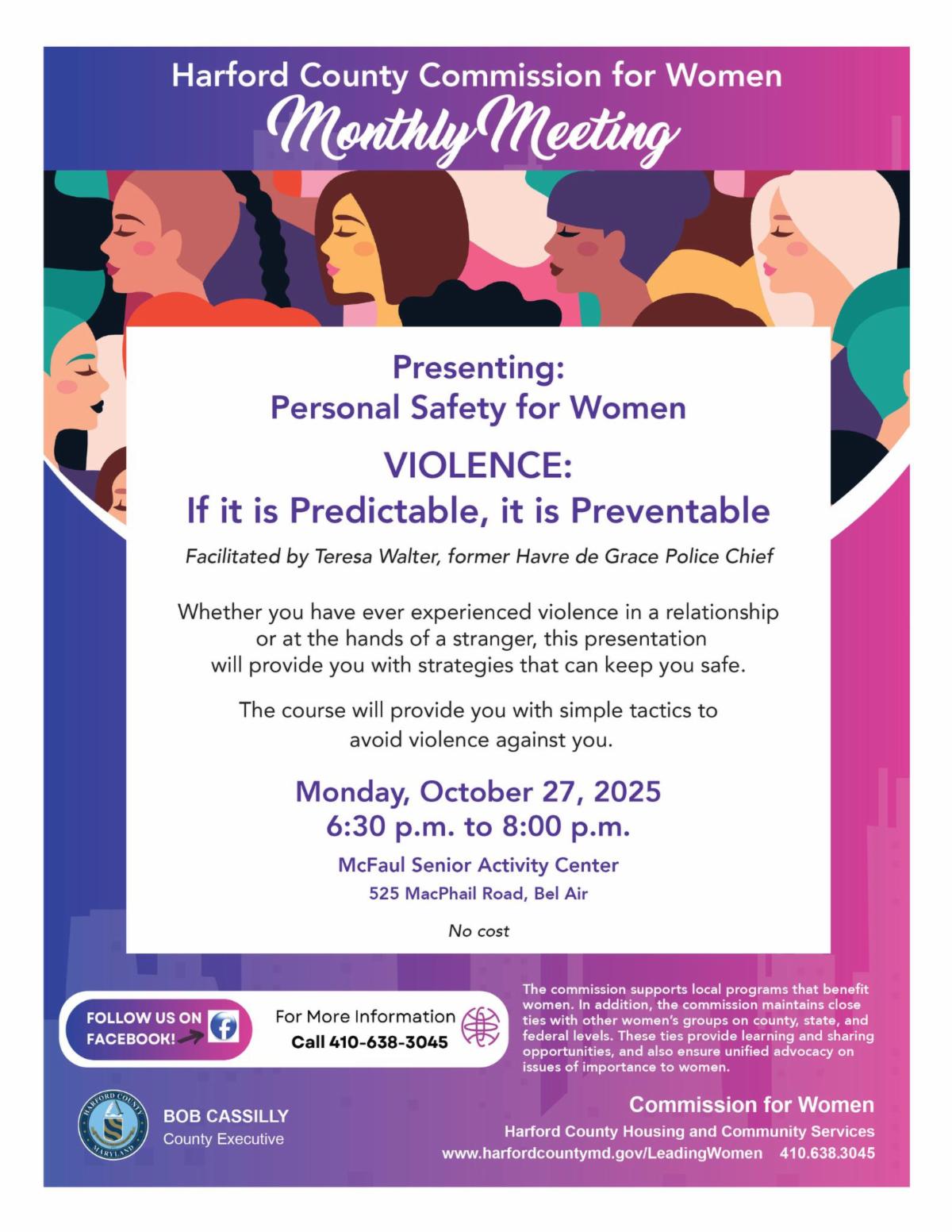 Please consider joining the Harford County Commission for Women at our October meeting on Monday, October 27, 2025 at a special time: 6:30 - 8:00 p.m. at the McFaul Senior Activity Center for a "Personal Safety for Women" presentation. The course will provide attendees with simple tactics to avoid violence against them. There is no cost to attend, and anyone is welcome.