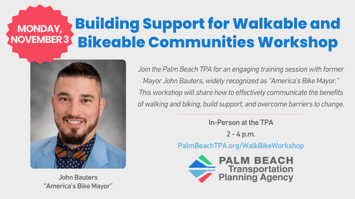 The Palm Beach TPA invites planners, engineers, and elected officials to take part in a special training session with former Mayor John Bauters, widely known as “America’s Bike Mayor”, on November 3 at 2 p.m. This engaging workshop will explore how to create communities that are safer and more accessible for people walking and biking. Attendees will gain insight on building public support, communicating the benefits of active transportation, and overcoming common challenges to change. Register to attend in person at PalmBeachTPA.org/WalkBikeWorkshop.