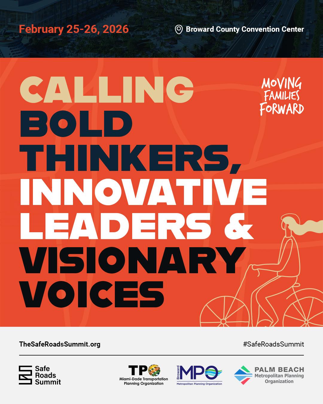 The 2026 Safe Roads Summit will take place February 25–26, 2026, at the Broward County Convention Center. The event is hosted by the Broward MPO in collaboration with the Miami-Dade TPO and the Palm Beach MPO. Formerly known as the Safe Streets Summit, this event brings together policymakers, technical experts, and community advocates to promote safer roads that support vibrant communities, drive economic development, and shape the future of transportation through innovation and technology. Early Bird Registration is now open! Secure your spot at a discounted rate before prices increase. Early Bird pricing is available through December 16, 2025.
