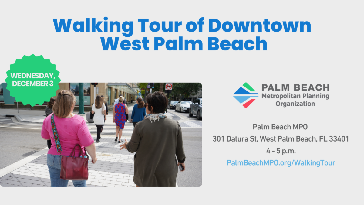 Join the West Palm Beach DDA and Palm Beach MPO for a mobile tour on walkability and placemaking in downtown WPB. Explore how public-private partnerships, design, and land use policies enhance public spaces, support economic vitality, and improve quality of life. The event includes networking, a walking tour of completed and ongoing projects, and discussion of future opportunities. Ideal for planners, elected officials, and community members interested in creating vibrant, people-focused places. Register at PalmBeachMPO.org/WalkingTour.