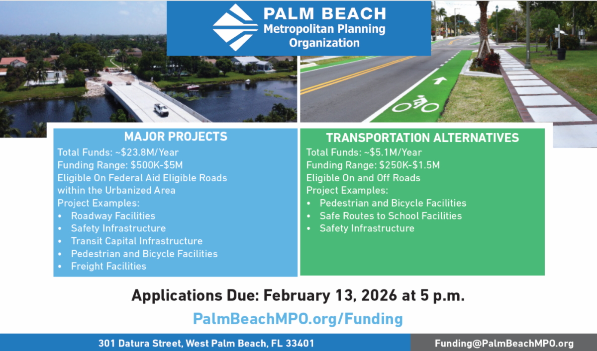 The Palm Beach MPO hosted its 2026 Call for Projects Workshop to share information about available project funding resources, coordinating updates to the Long-Range Transportation Plan, and providing program eligibility and submittal requirements. To watch the workshop recording and view the presentation, visit PalmBeachMPO.org/Funding.