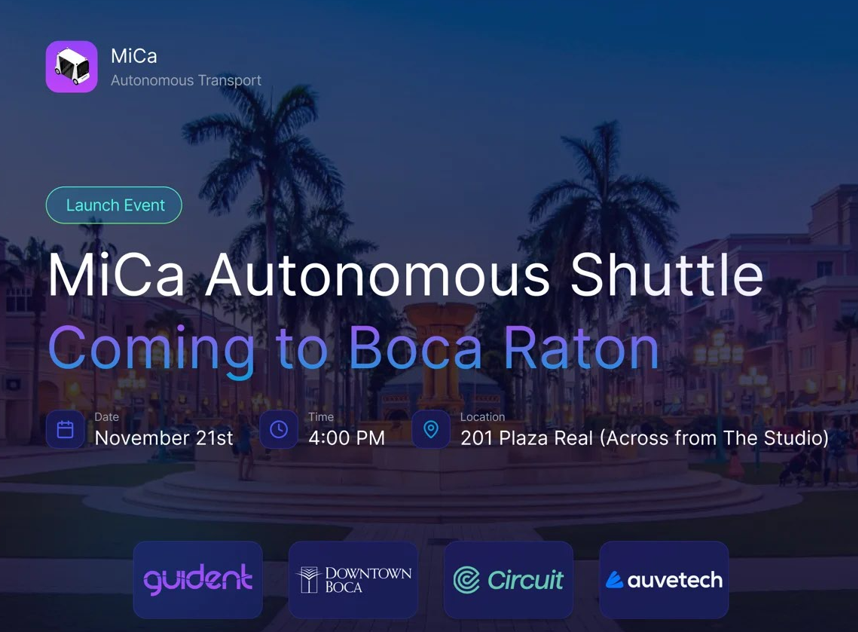 Join the City of Boca Raton for a community celebration launching MiCa, the City’s new autonomous electric shuttle, at Mizner Park on Friday, November 21, 2025, at 4 p.m. The event will feature shuttle demonstration rides, hands-on technology showcases, and opportunities to learn how autonomous transit is supporting safer, more connected, and sustainable mobility in Boca Raton. Learn more and RSVP here.