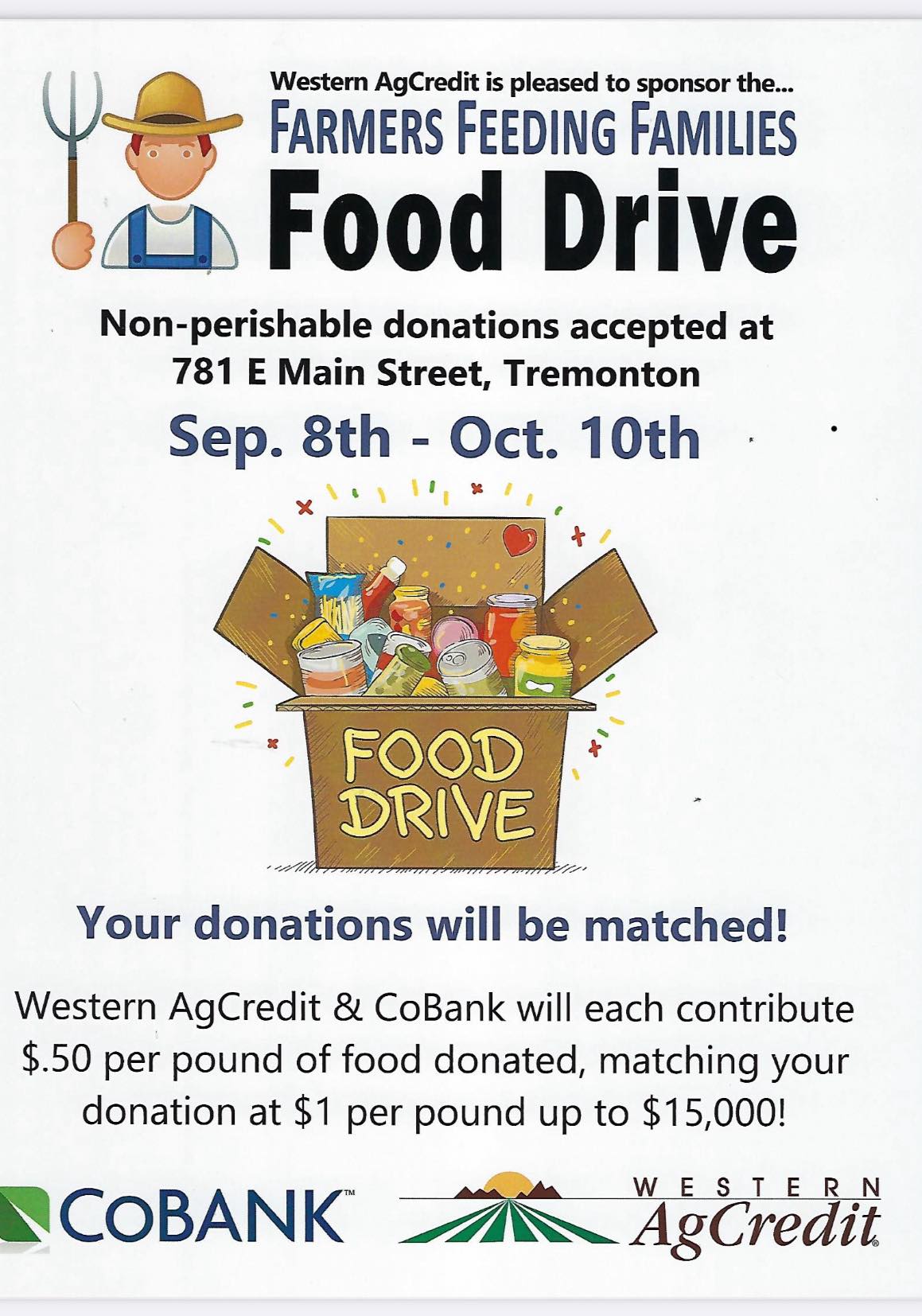 Starting September 8th and goes till October 10th, our sponsors, Western AgCredit and CoBank, will match .50 per pound of food donated! Please be a part of helping feed families by donating non-perishible food to AgCredit. Please see the full flyer below.