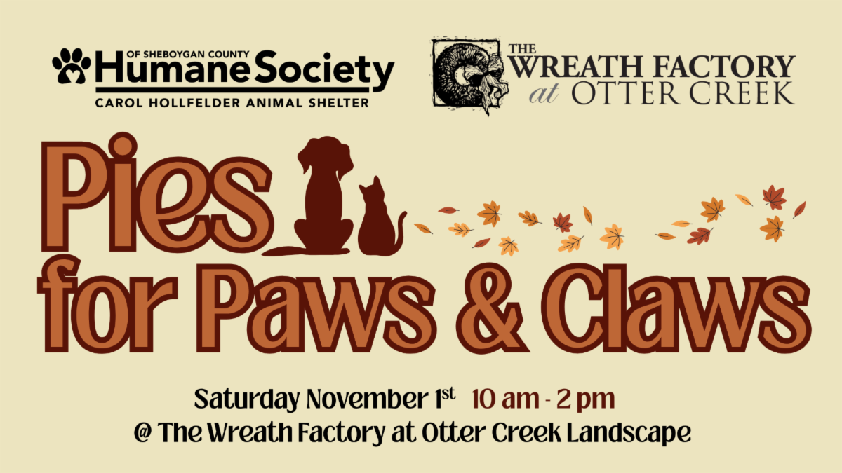 Preorder your 9” take-and-bake Dutch Apple, Mixed Berry, or Pumpkin pies now through Sunday, October 19, and support the animals at the Humane Society of Sheboygan County. Every pie sold helps provide care, comfort, and second chances for pets in need.