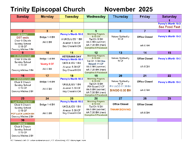 Your Bay View: Trinity's bi-weekly e-newsletter, the Bay View, reaches members and friends every other Friday, sharing news and inspiration for and about our parish. Please send information and announcements, as well as photographs, to info@trinityapalachicola.org or call the church office at 850-653-9550. The deadline for submission is noon on Wednesday of each publication week. (next deadline is November 19)