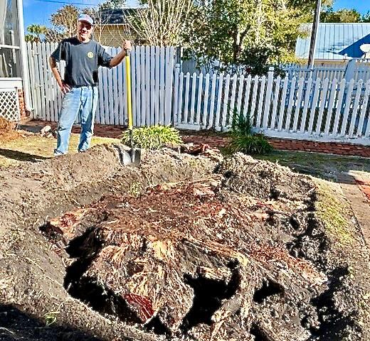 | | | Determined Man vs. Stubborn Tree Stump | | For many years, a cedar tree grew in the side yard of the Rectory. When it was damaged by Hurricane Michael in 2018, the tree was taken down, leaving an enormous stump at ground level. Recently, Dee Crusoe and Alan Pierce determined, while working on improvements of the church grounds, that the stump had to go. With the help of Mike Barber and his stump grinder, followed by some persistent digging by Alan, the stump has now disappeared. | | | |