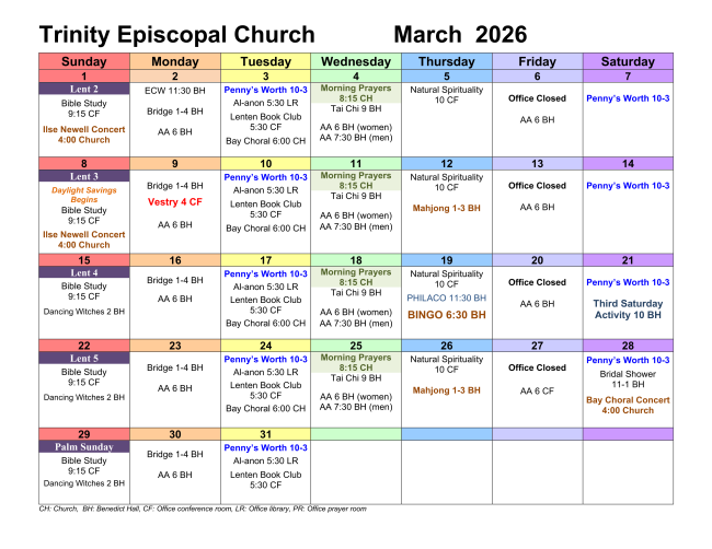 Your Bay View: Trinity's bi-weekly e-newsletter, the Bay View, reaches members and friends every other Friday, sharing news and inspiration for and about our parish. Please send information and announcements, as well as photographs, to info@trinityapalachicola.org or call the church office at 850-653-9550. The deadline for submission is noon on Wednesday of each publication week.