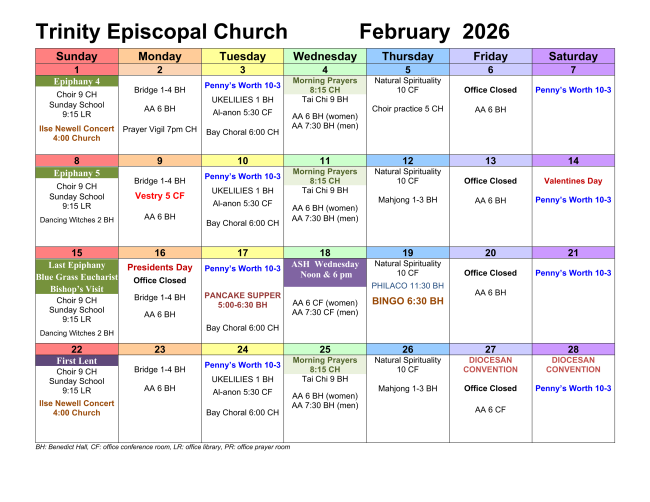 We are excited to announce the plans for our regular 10:30 am Sunday, February 15 service. Our bishop, Russell Kendrick, will be here for his annual visit. He will celebrate the Holy Eucharist and welcome eight new members joining Trinity as full-fledged Episcopalians! A ninth person has asked to reaffirm their commitment as an Episcopalian.