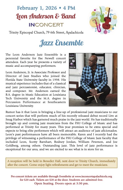 Your Bay View: Trinity's bi-weekly e-newsletter, the Bay View, reaches members and friends every other Friday, sharing news and inspiration for and about our parish. Please send information and announcements, as well as photographs, to info@trinityapalachicola.org or call the church office at 850-653-9550. The deadline for submission is noon on Wednesday of each publication week. Next deadline is February 11.