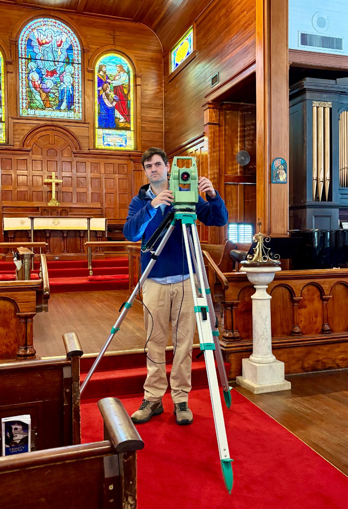 | | Recently, two gentlemen stopped to tour the church. As he usually does for everyone during the week, Father Stephen showed them around the historic building. It turns out that they are historical surveyors with a vocation that takes them around the world to document architectural details of historically valuable structures. | For a good portion of January, Ed Barnes and Bill Blake of the group Atlantic Heritage created highly detailed records of the composition and design of our historic church. To give you an idea of this work, they spent nearly a week in the attic drawing all the joints, hips, and eaves. | | |