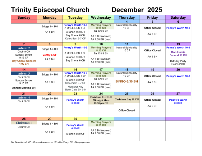 Please plan on attending Trinity’s annual meeting immediately after the December 14 service. We will meet in Benedict Hall. Those members physically present will make the quorum, which is needed to vote to accept the annual report as well as selecting two new vestry members and approving the 2026 budget. Sorry, we confirmed the bylaws do not allow for proxy voting.