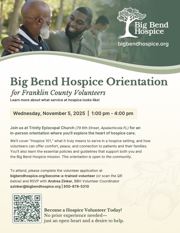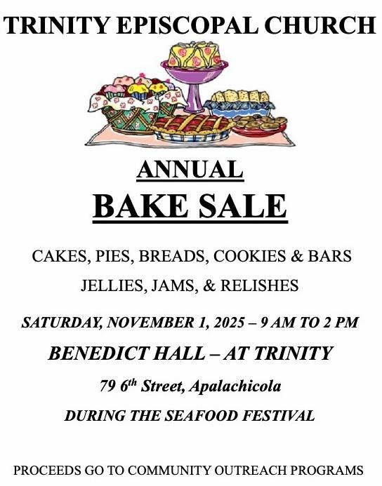 Your Bay View: Trinity's bi-weekly e-newsletter, the Bay View, reaches members and friends every other Friday, sharing news and inspiration for and about our parish. Please send information and announcements, as well as photographs, to info@trinityapalachicola.org or call the church office at 850-653-9550. The deadline for submission is noon on Wednesday of each publication week. (next deadline is November 5, 2025)