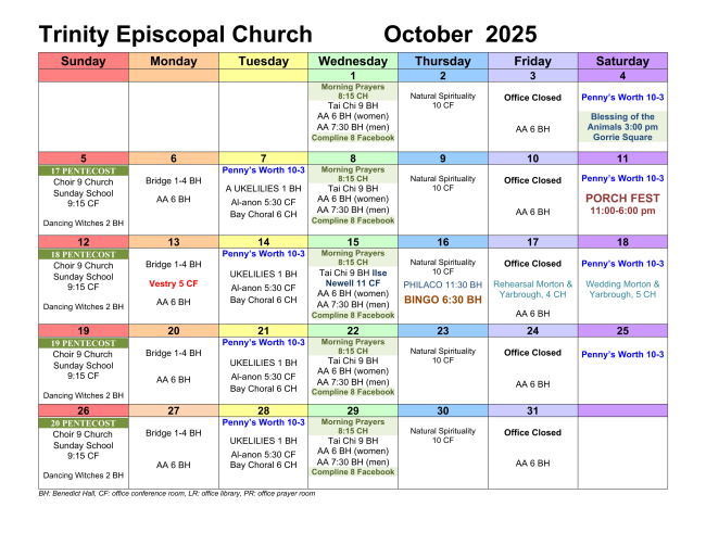 Ministry Fair October 26. We are excited to announce that our Ministry Fair will be held in Benedict Hall immediately after Sunday service. Travis Pecot has lined up a fantastic group of volunteers eager to talk to you about the following ministries: Cursillo (retreat); ROMEOs (wizened patriarchs of the church); What the Holy Health (body work); Diocesan Lay School (licensed ministry); Catechism/Formation (becoming Episcopalian); Grill Team (for the Holy Smoker); Hospice; Food Pantry; ECCC/Meal on Wheels; Memorial Garden; Outreach; Parish Life; Tour of Homes; Penny’s Worth; Altar Guild; Flower Guild, Acolytes; Lay Eucharistic Ministers (serves wine); Choir and Music; Lectors; Ushers and Greeters; and a few others. Use this as an opportunity to find out more information about how you can serve God’s church.
