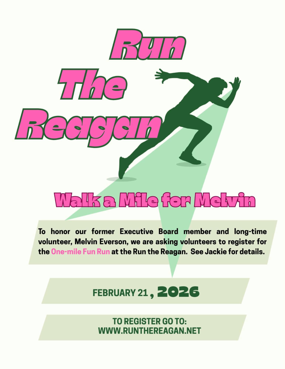 Melvin has been our liaison with the Run the Reagan event for many, many years. This year to honor him we are asking you to register for the one mile Fun Run and Walk a Mile for Melvin. Stop in the day of the race at the refreshment table and get your Mile for Melvin ribbon. After the walk, we will meet back at the refreshment table and say a prayer for his healing and well-being.