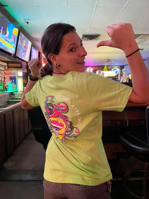 Featured in the photo, my friend Sabrina who recently purchased a shirt to support Dive Pirates, she loves to wear it while bartending because everyone asks her about that cool design, etc. and she isn't shy telling people to check us out online. Thank you, each and every one of you for being an amazing ambassador of the cause!