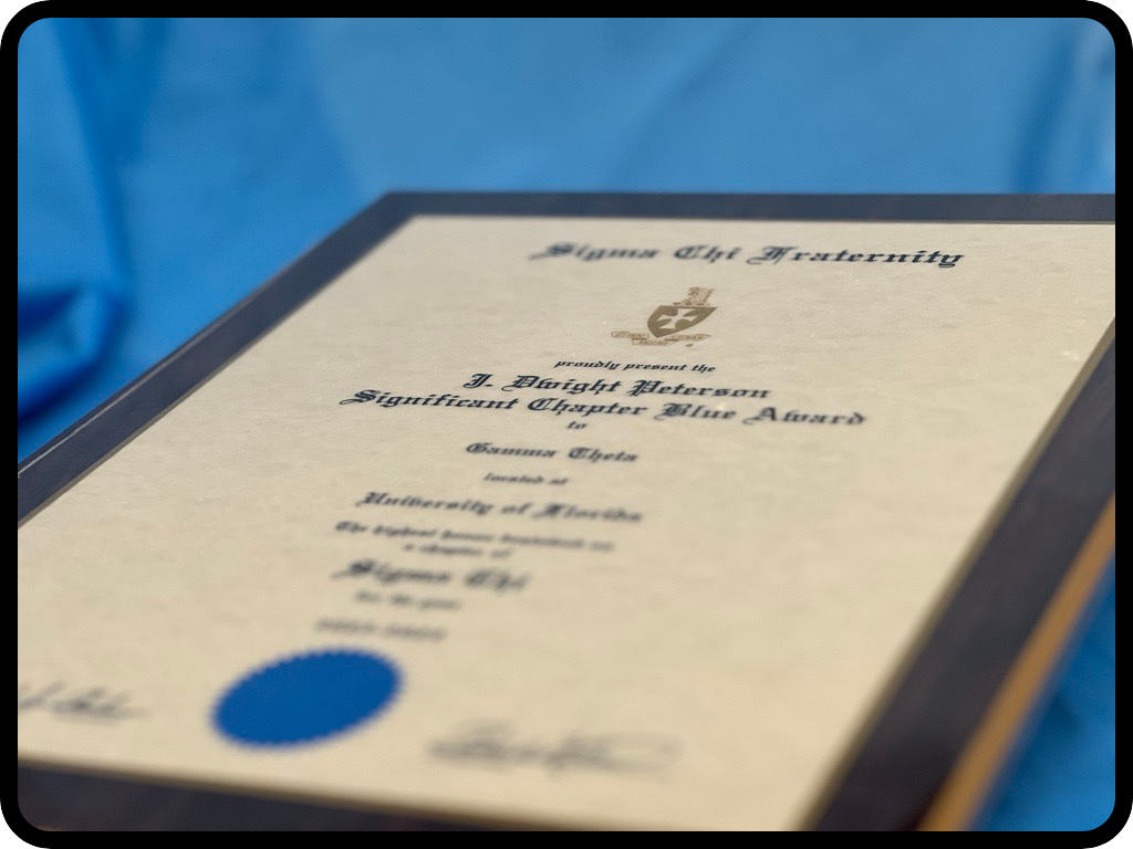 The 2024 J. Dwight Peterson Significant Chapter Award was presented to only 76 chapters at colleges and universities in the United States and Canada and the Alpha Upsilon chapter received that honor for the second year in a row! Established in 1964, the Peterson Award recognizes chapters that achieve excellence in all operations, including academics, philanthropy, recruitment, and Ritual performance.