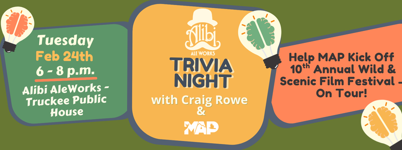 Join Mountain Area Preservation (MAP) “On the Road” to their 10th Annual Wild & Scenic Film Festival On Tour! On Tuesday, February 24th, from 6:00 to 8:00 p.m., MAP will be a part of Alibi Truckee Trivia Night, hosted by Craig Rowe. (We have two great Craig Rowes in town!)