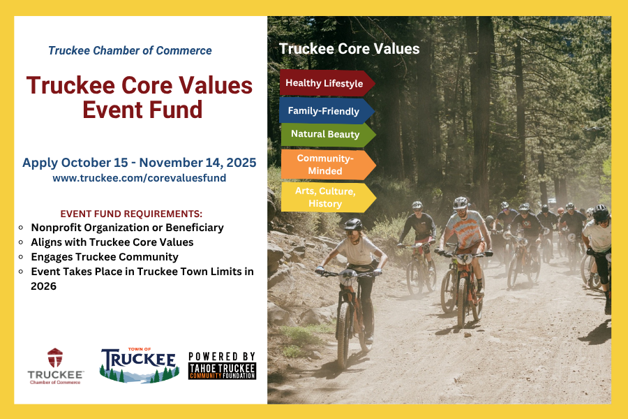 This Friday, November 14 is the last day to apply for the Truckee Core Values Event Fund! The Truckee Core Values Event Fund is a community event fund created by the Truckee Chamber of Commerce in partnership with the Town of Truckee and powered by the Tahoe Truckee Community Foundation. The fund supports marketing of nonprofit organization events or events that partner with nonprofit organizations that align with at least one of the five Truckee Core Values: