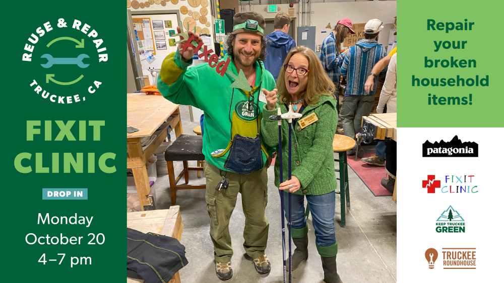 If it’s broke, fix it! Let’s extend the life of our products, and keep them out of the landfill. Bring your broken electronics, furniture, clothing, outdoor gear, and more. “Fixit Coaches” from the Truckee Roundhouse will teach you how to repair your item. This is a FREE community event run by volunteers!