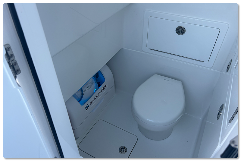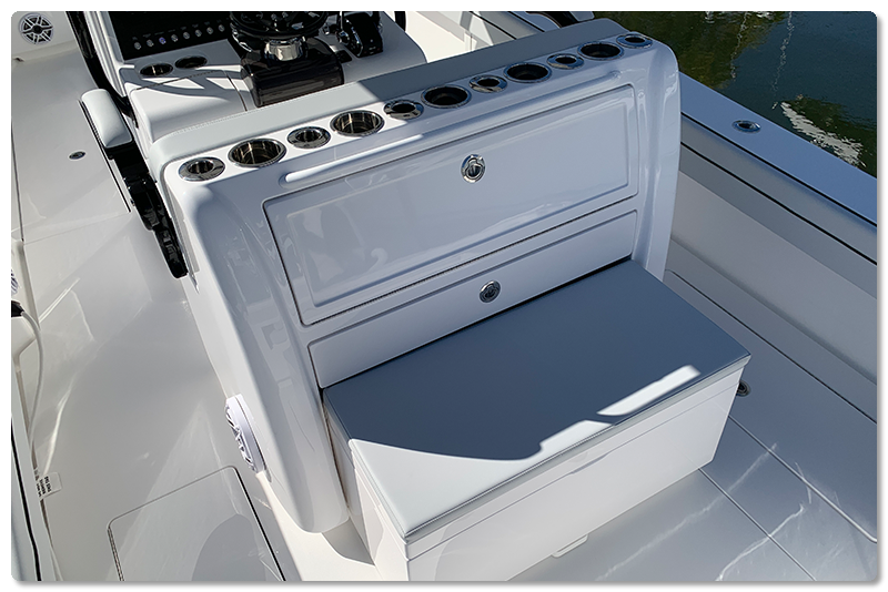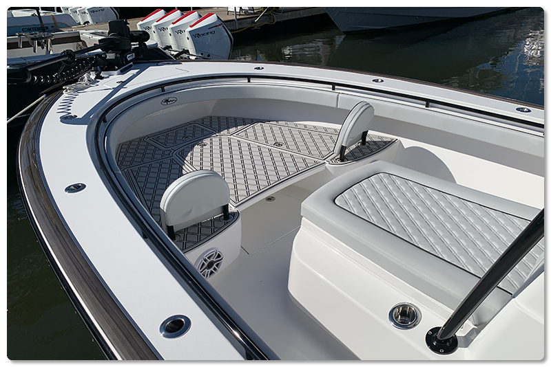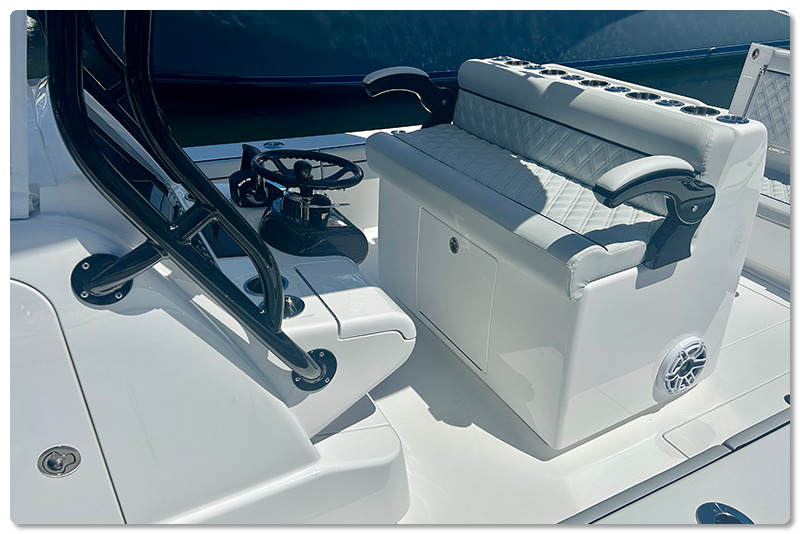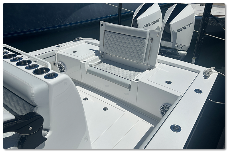 Toekick space is built into the entire deck, including space around the console, helm seating module and aft casting deck (which holds twin live wells and integrated flip-up seat). Twin Mercury 300-hp Verados provide exceptional power, and she’s also equipped with twin PowerPoles.
