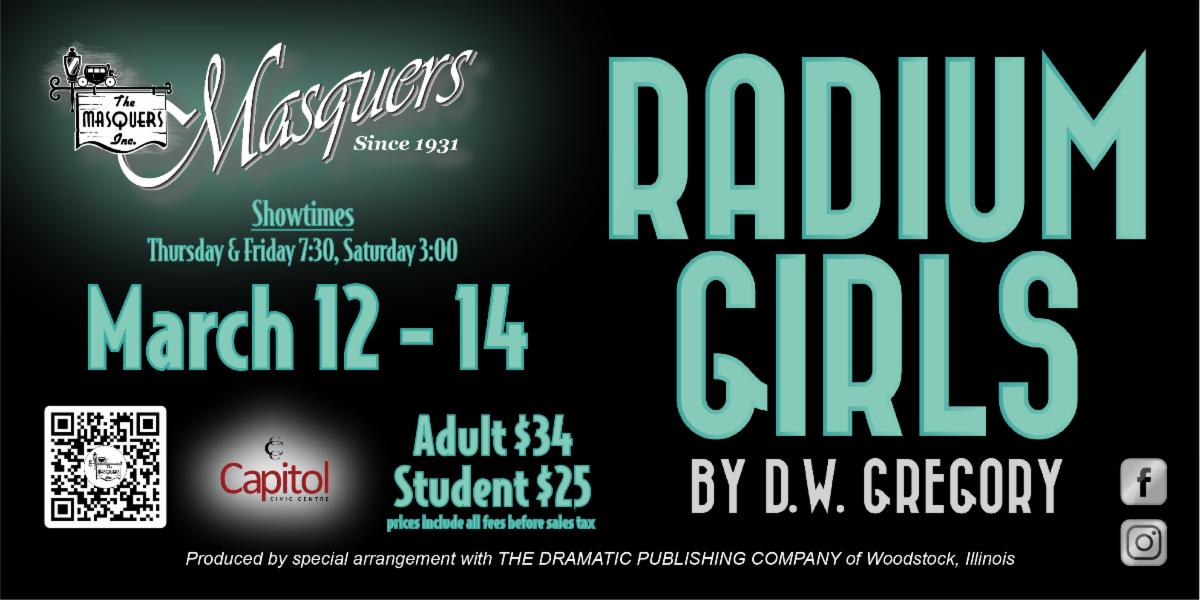 The Masquers, Inc.: In 1926, radium was a miracle cure, Madame Curie an international celebrity, and luminous watches the latest rage—until the girls who painted them began to fall ill with a mysterious disease. Inspired by a true story, Radium Girls traces the efforts of Grace Fryer, a dial painter, as she fights for her day in court. Written with warmth and humor, Radium Girls by D.W. Gregory is a “powerful” and “engrossing” evening at the theatre with The Masquers, Inc.!
