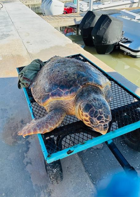 On August 11, Save-A-Turtle received a call from FWC dispatch regarding a severely injured Loggerhead sea turtle spotted in Jewfish Basin. The animal was reported to be “in distress and bleeding,” likely from a boat strike. The rescuer on scene transported the turtle by boat to Beach Weekend Marina, where SAT volunteers were asked to meet, assess the situation, and coordinate with FWC for potential transport to The Turtle Hospital.
