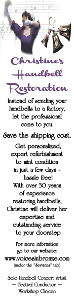 Derek Nance and I are again sharing the repair and maintenance class for both Malmark and Schulmerich handbells. Please be thinking of a problem you've encountered with your bells and need some expert advice on what to do. Bring your questions and problems, let us help you solve them - sometimes with an off-the-wall solution! Also, please bring you sick bell to class for us to fix. We have ideas for maintenance you might not have thought about.
