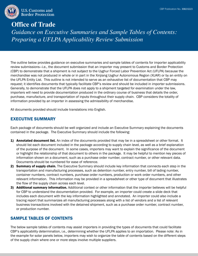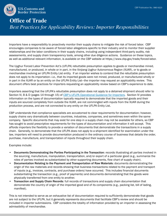 CBP is undertaking multiple efforts to provide more information for companies seeking to comply with the Uyghur Forced Labor Prevention Act and Section 307 of the Tariff Act of 1930 (19 U.S.C. 1307).