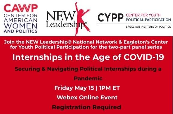 With the current state of the world, many college students have found their summer internship plans falling through and/or are struggling to find internship placements for the summer or fall. To help college students interested in becoming public leaders navigate these difficult changes, the Center for American Women and Politics' NEW Leadership National Network and the Center for Youth Political Participation are hosting a two-part webinar series, "Internships During COVID-19."