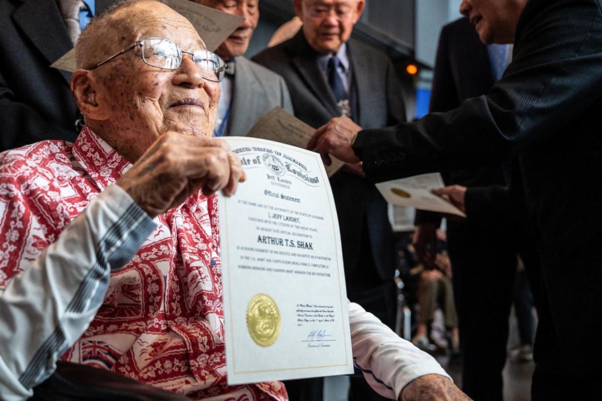 Six Chinese American WWII veterans, some in their 90's, received the Congressional Gold Medal at the National WWII Museum in New Orleans, representing thousands who served despite facing discrimination and the Chinese Exclusion Act. A 2018 bill, prompted by veteran groups, awarded them the highest civilian honor, with the ceremony delayed due to the pandemic. | |